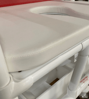 The Bariatric Soft Seat Shower Commode with Footrest (700 Series) has a 700 pound weight capacity and a choice of 26”, 28” or 30” seat width.