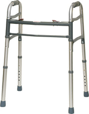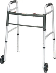 The ProBasics Aluminum Folding Walker With Wheels is a mobility aid designed to assist people who have difficulty walking or maintaining balance. It is manufactured by Compass Health Brands, a trusted provider of high-quality medical equipment.