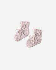 Adorable knit booties with ties at the ankle for a snug, secure fit.